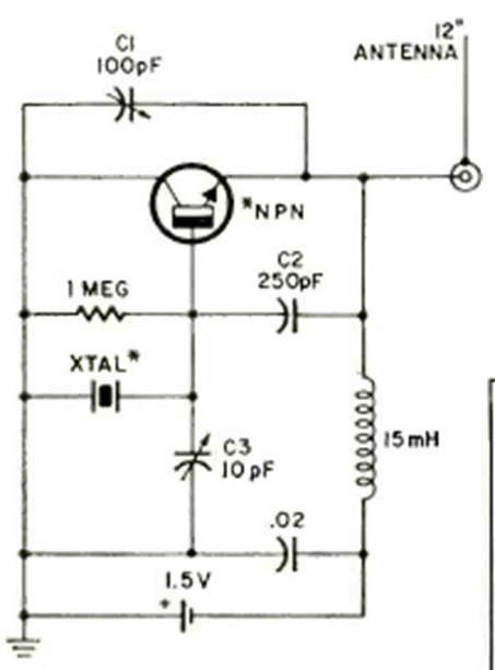We found this circuit in a Radio Electronics from February 1970. The frequency of 1,400 kHz in the original depends on the crystal and can be changed depending on the transistor used.