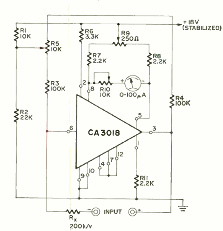 We found this sensitive high input impedance voltage amplifier in the November 1970 Radio Electronics magazine. The circuit is powered by 18 V power source.