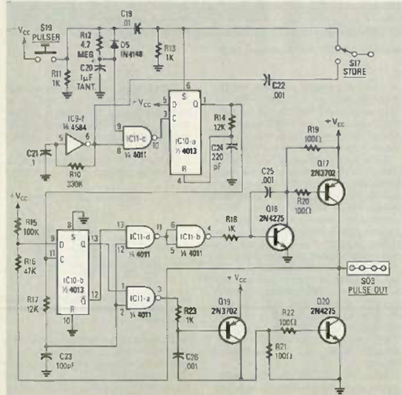 This circuit is part of an integrated circuit tester published in an article in Radio Electronics magazine in September 1985. The circuit is powered by a 9 to 12 V source.