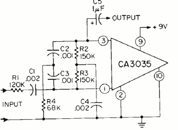 This circuit amplifies signals only in the frequency range determined by the double T. The circuit is from a Radio Electronics from February 1970. The integrated circuit is the CA3035 released by RCA at the time.