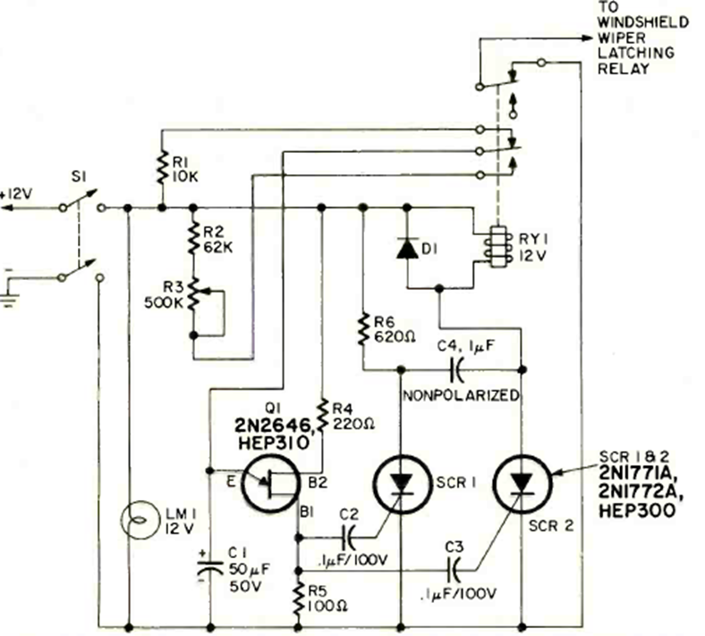 This circuit was found in the December 1971 issue of Radio Electronics magazine. The circuit is for cars of the time that did not have this factory feature as they do today. The circuit uses a lamp as power indicator.