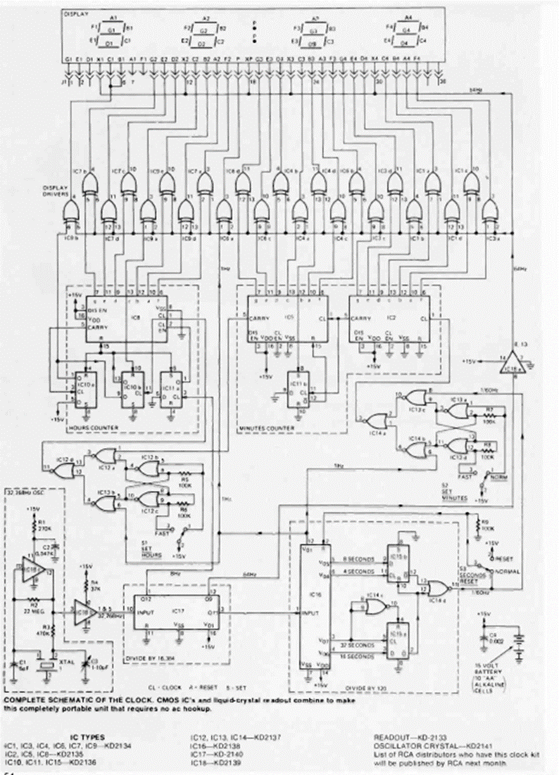 This CMOS logic-based circuit was found in the April 1974 issue of Radio Electronics magazine. The circuit is based on a period display and has hour and minute indications.