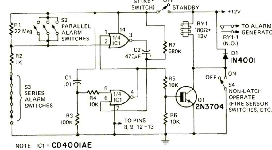 This alarm with automatic shutoff was found in the April 1975 Radio Electronics magazine. The activation time is given by C1 and R3. The alarm uses series and parallel sensors.