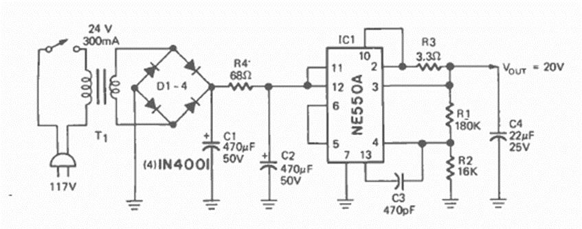 Indicated to power a decoder system circuit, this power supply used a regulator circuit of the time. We found it in the Radio Electronics magazine of October 1975. The current is of the order of 200 mA.
