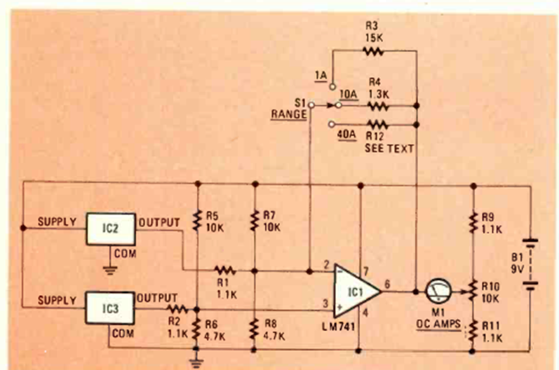 The circuit in the figure uses hall sensors to obtain the current measurement through the magnetic field. The circuit is from Radio Electronics from July 1984. The power supply is provided by a 9 V battery.