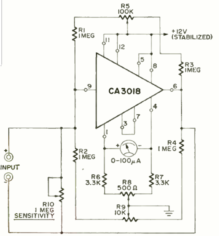 Using an RCA integrated circuit, this instrumentation amplifier was found in a November 1970 Radio Electronics magazine. The instrument has a full scale of 100 uA.