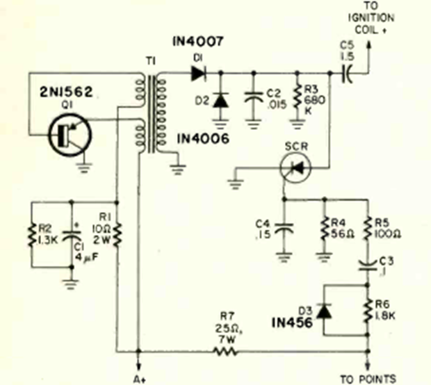 This capacitive discharge ignition system with 1 transistor and 1 SCR was found in the April 1972 issue of Radio Electronics magazine. The transistor is high power and must be mounted on a heat sink.