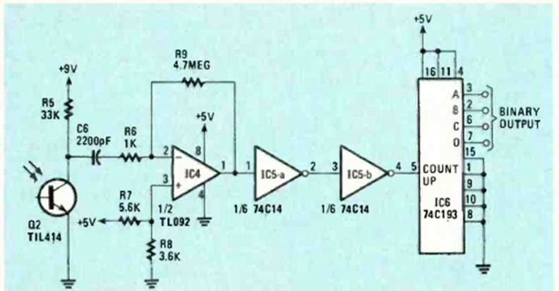 This is a circuit for receiving signals from the previous transmitter. The circuit uses a common phototransistor. It was found in the August 1984 issue of Radio Electronics magazine.