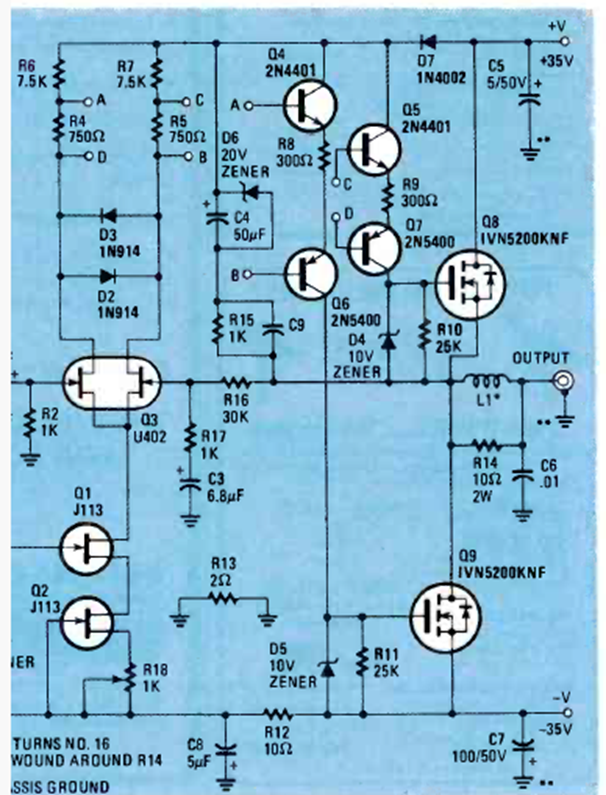 This amplifier, which should have a power of close to 100 W, was found in the Radio Electronics magazine of July 1983. The quiescent current should be set at 100 mA.