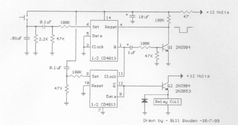 This circuit was found in documentation from the 90s, using components from that time. The integrated circuits are COMOS 4013, and the power supply must be provided with the voltage appropriate to the application.