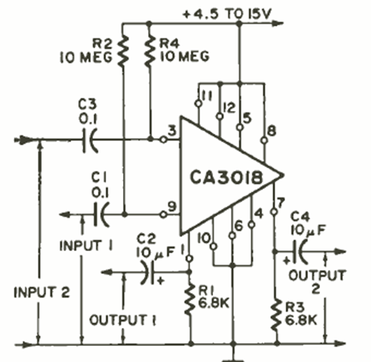 This circuit was found in the August 1970 issue of Radio Electronics magazine. It employs RCA's newly introduced CA3018 differential amplifier.