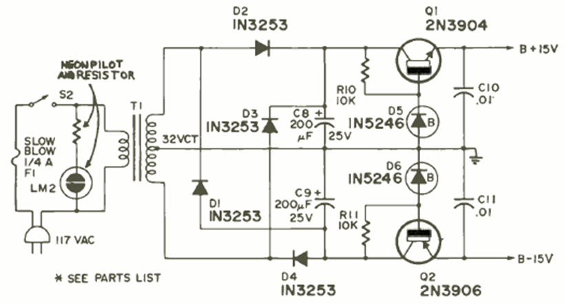 This circuit was found in the February 1971 issue of Radio Electronics magazine. It is designed to power the previous circuit, providing a maximum current of around 50 mA.