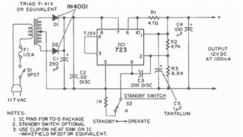 Using the 723 integrated circuit, this power supply has the voltage determined by R2 and R3, which can be changed. The circuit is from a Radio Electronics magazine from July 1971.