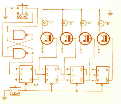 This TTL circuit was found in the February 1973 issue of Radio Electronics magazine. The power supply is 5 V. The counter is 4 bits. The transistors are general purpose types.