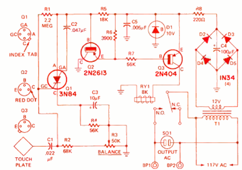 This circuit is from an article in Radio Electronics magazine from August 1972. The circuit is based on a unijunction programmable transistor driving a relay. The circuit uses transistors that were common at the time.