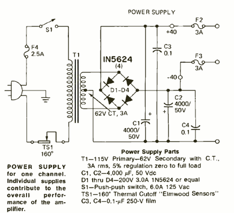 This dual power supply for power amplifiers with a voltage of 40 V and a current of 3 A was found in the magazine Radio Electronics of April 1973. The list of materials is given in the text corresponding to one channel of a 60 W amplifier.