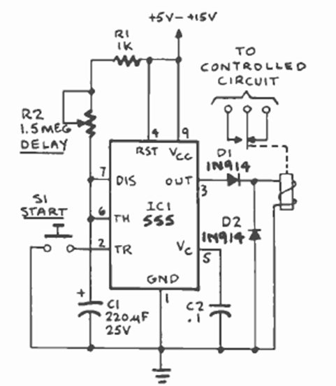 This is one of the possible timer configurations with the 555. We found it in October 1986 Radio Electronics magazine. It directly activates a relay. The time is given by C1.