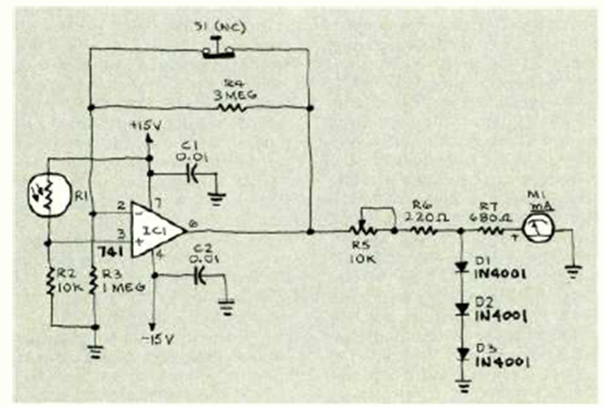 Using an LDR as a sensor, this circuit is from the Radio Electronics magazine of December 1984. The operational amplifier is the 741 and the source must be symmetrical.