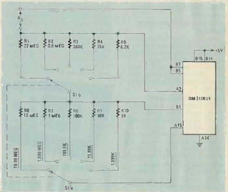 This resistance meter circuit was found in the February 1984 issue of Radio Electronics magazine. It is based on a digital module from that time. The power supply is 5 V.