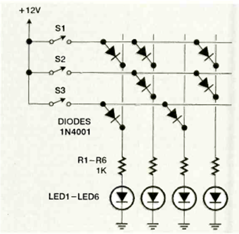 The combination of diodes determines which of the LEDs will light when one of the switches is activated. The circuit is from the August 1997 Electronics Now magazine.