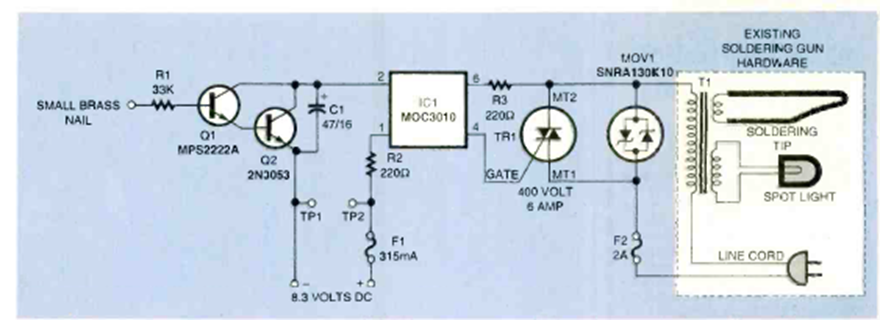 This electronic soldering gun circuit was found in the December 1998 Electronics Now magazine. The article it appeared in featured an electronic triac control.