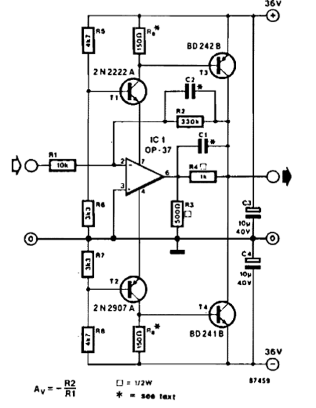 The purpose of this circuit is to send signals on low impedance lines with a maximum voltage of 70 Vpp. The circuit is from a 103 Circuits publication from the 1990s and must be powered with a dual 15V source.