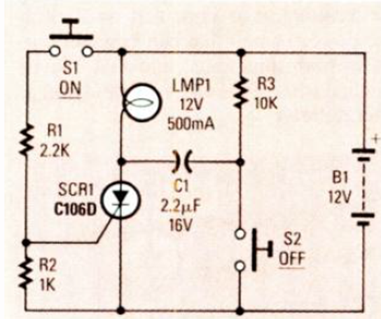 This circuit uses a capacitor to momentarily reduce the anode-to-cathode voltage of the SCR for shutdown. The circuit is one of many similar circuits found in this section. It appeared in the September 1987 issue of Radio Electronics magazine.