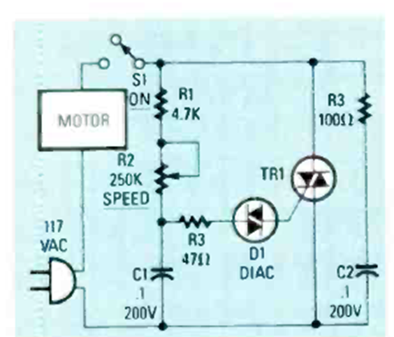 This triac control was found in the October 1987 Radio Electronics magazine. The triac must be equipped with a heatsink and current rating according to the motor.