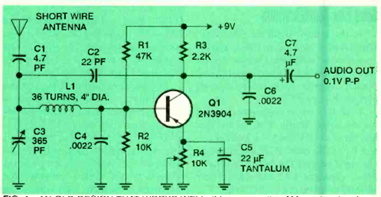 This simple circuit has good gain and can be implemented with any general-purpose transistor. The circuit is from Electronics Now, June 1997. The coil determines the frequency range.