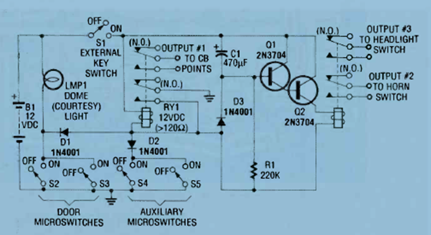 This circuit was found in the Electronics Experimenter Handbook of 1961. The circuit uses door sensors and others. It is powered by 12 V from the car battery.
