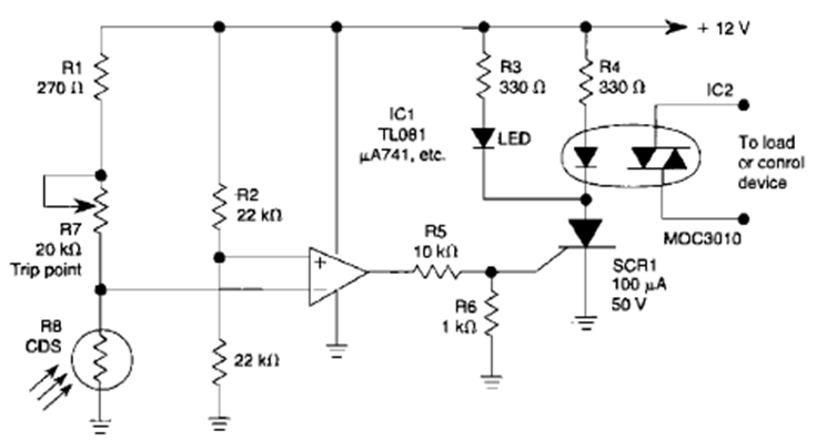 Using an LDR as a sensor and an operational amplifier this circuit was found in the Encyclopedia of Electronic Circuits volume 5 from 1995. The circuit triggers an optodiac.