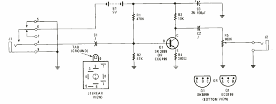 We found this circuit in Radio Electronics Special Projects from 1992. The circuit turns on the power when the microphone plug is inserted into the input jack.