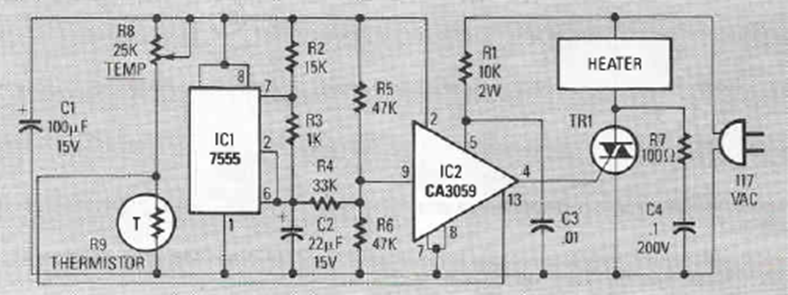 The Triac trigger integrated circuit is not very common nowadays. The circuit was found in the Radio Electronics Experimenter magazine from 1989. The triac should be in accordance with the heater.
