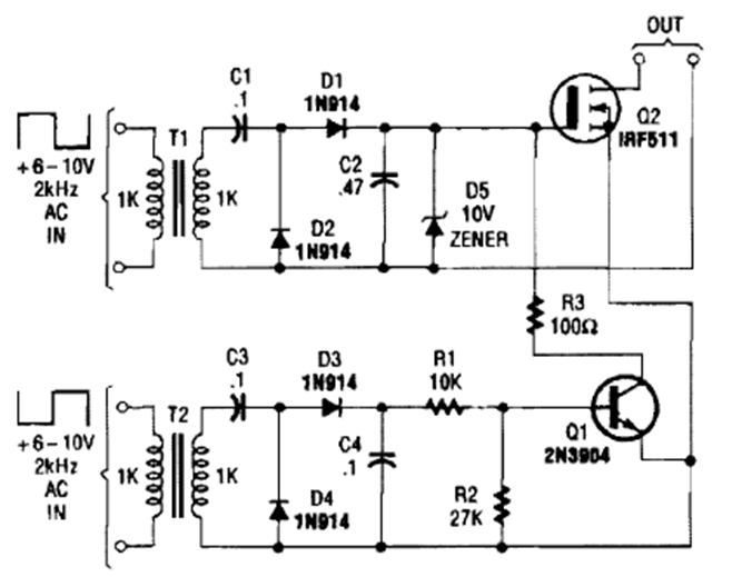This circuit switches power loads with audio signals. The circuit is from a Popular Electronics from the 90s. The components can be changed depending on the signal used.