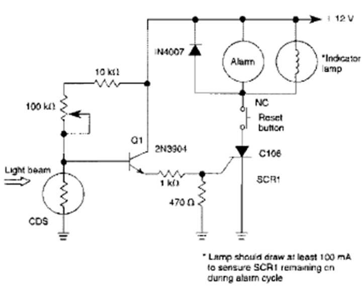 This circuit triggers a buzzer or other warning device when the light falling on the sensor is cut off. We found it in the Encyclopedia of Electronic Circuits Volume 5 of 1995.