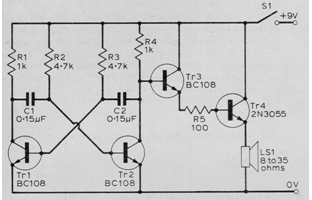 This circuit was found in a 1974 publication, but it can be mounted with BC548 transistors and powered with voltages from 6 to 12 V. The TR4 transistor must be mounted on a heat radiator. It generates an audio tone determined by C1 and C2. See in the math section for electronics how to calculate these components for the desired frequency.