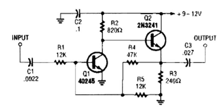 This amplifier stage was obtained from a Popular Electronics from the 90s. The transistors are general purpose.