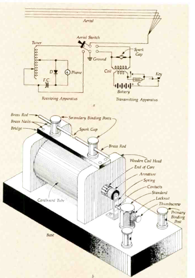 Found in an old publication, this is a transmitter with a spark coil. The high frequency oscillations of the high voltage spark generate the signal thrown at the antenna.