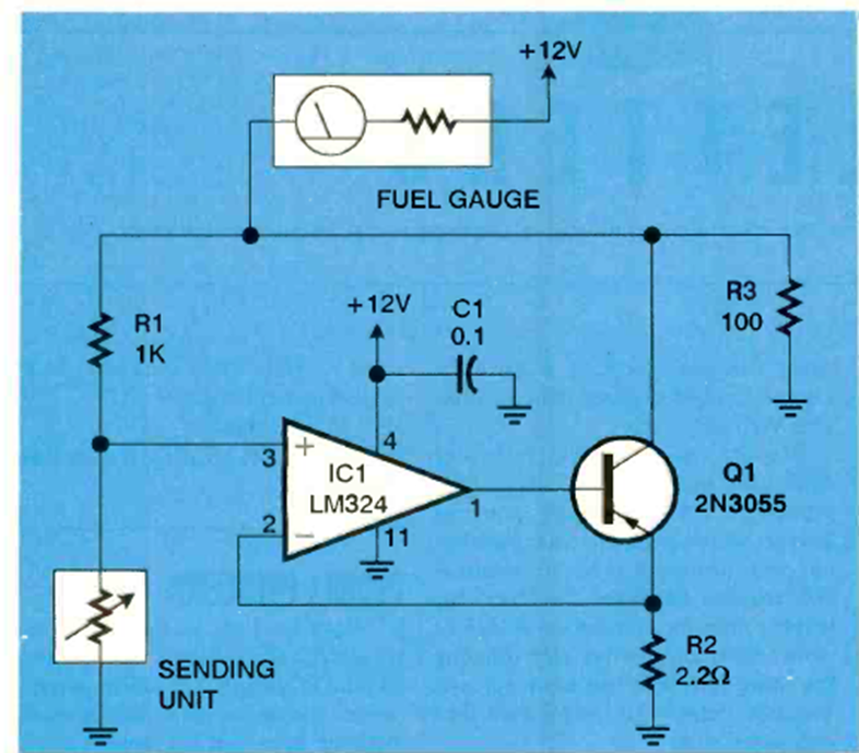 This automotive circuit was found in the June 1997 issue of Electronis now magazine. The circuit uses a common operational amplifier powered by 12 V.