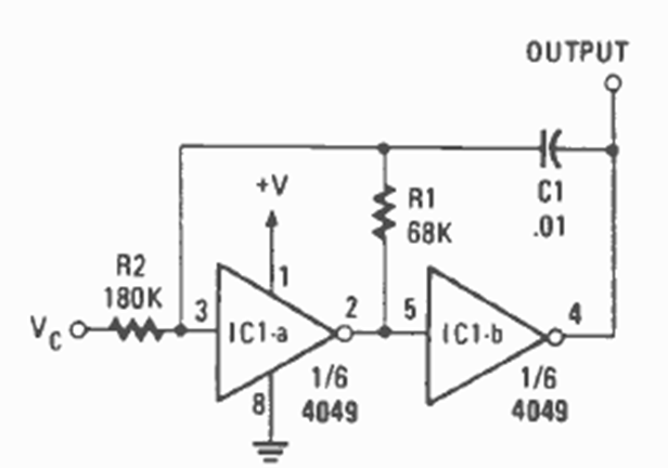 This voltage-controlled oscillator is one of many versions that can be found on this site. The circuit has the frequency determined by C1. The power supply is between 3 and 12 V.