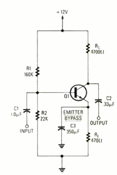 The figure shows how to increase the gain of the amplifier stage of the previous circuit. The transistor is general purpose, and the coupling is capacitive for AC amplification.