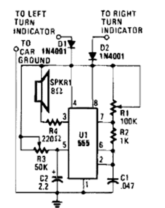 Using the 555 this circuit was found in a Popular Electronics from the 90's. The circuit directly drives a small speaker when the turn signal is turned on.
