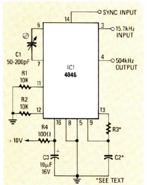 The purpose of this PLL circuit that we found in the November 1986 Radio Electronics magazine is to divide the frequency of a signal by 32. It inputs 504 kHz and outputs 15.7 kHz. The circuit is used with video signals.