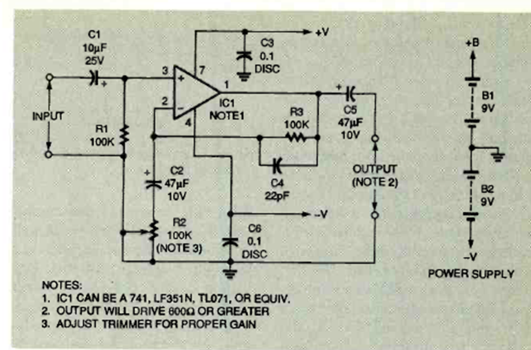This circuit was found in the August 1996 Electronics Now magazine. The circuit is based on an operational circuit whose type determines the gains and limits for the frequency.
