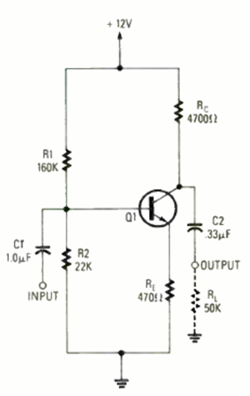 This capacitive-coupled stage can be implemented with any general-purpose transistor. The circuit can be used with 6 to 12 V supplies.