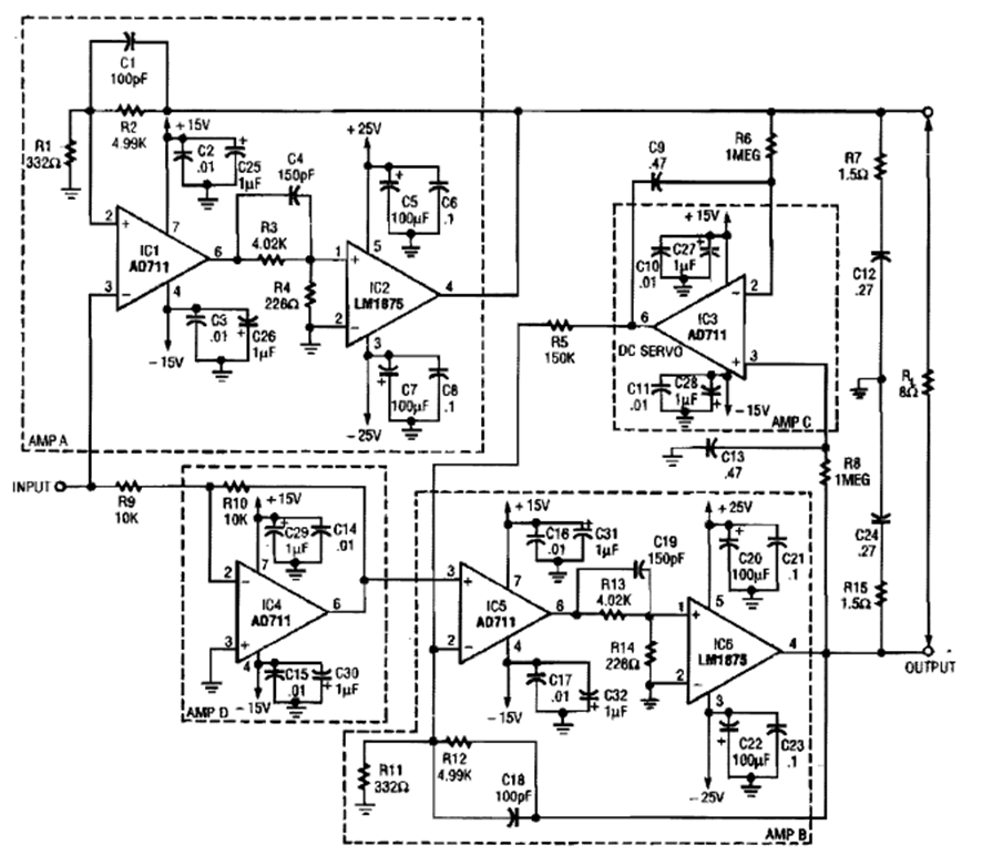 This amplifier was obtained from an Electronics Now from the 90s. The circuit has a dual 26V power supply. Power integrated circuits must be equipped with good heat sinks.
