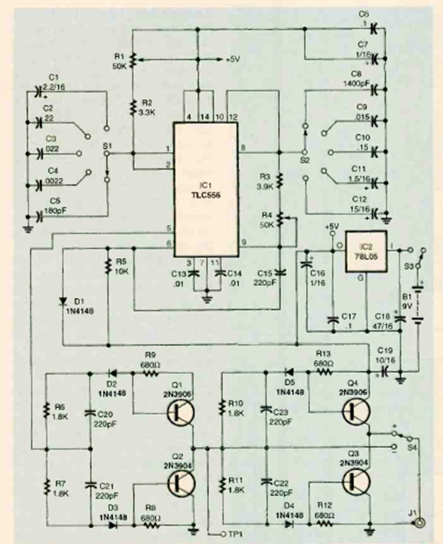 Using a dual 555 CMOS this very useful circuit on the bench was found in the July 1998 Electronics Now magazine. The circuit is battery powered.