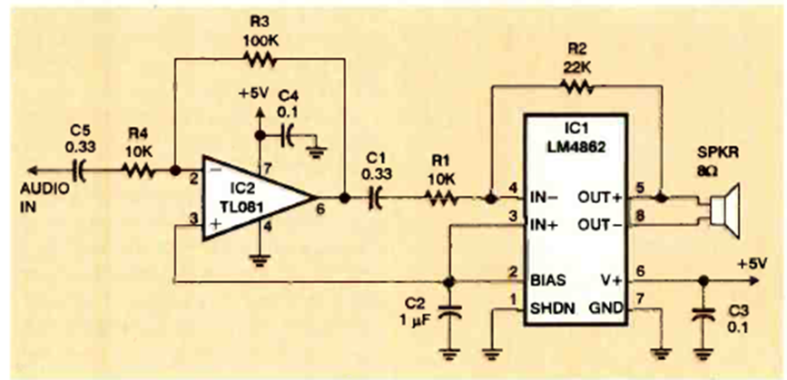 This low-power, low-supply voltage amplifier uses a preamplifier to achieve a high-gain configuration. The circuit is from the November 1999 issue of Electronics Now magazine.