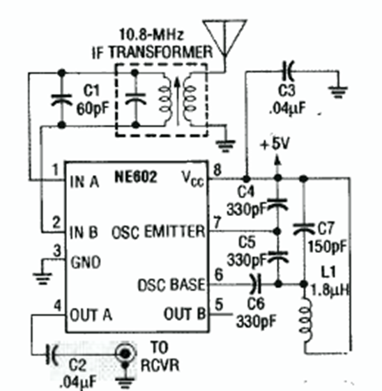 This single integrated circuit receiver was found in the 1992 edition of the Electronics Experimenter's Handbook. The tuning circuit is an FM radio IF transformer.