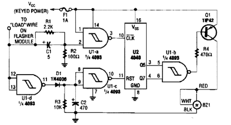 This circuit produces a signal when the turn signal is on, preventing it from being forgotten in this condition. The circuit was found in a Popular Electronics from the 80s.